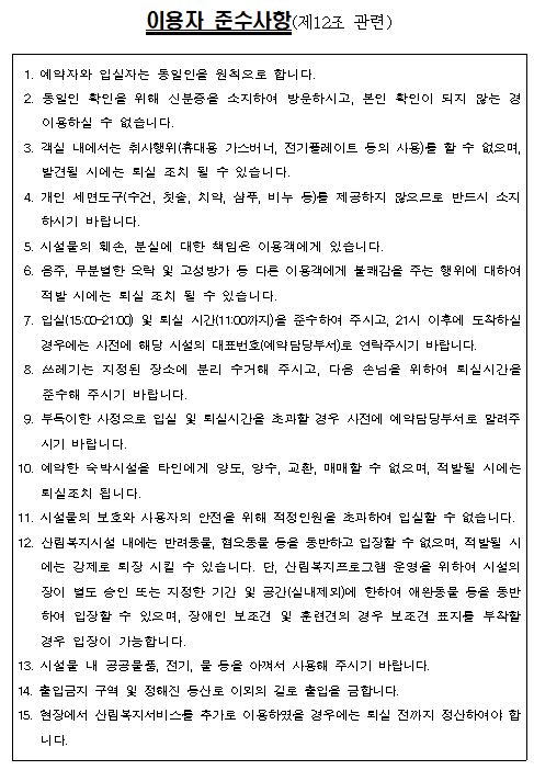 한국산림복지진흥원 산림복지시설 이용 지침 제12조(이용규칙의 준수)를 다음과 같이 준수하여 주시기 바랍니다.