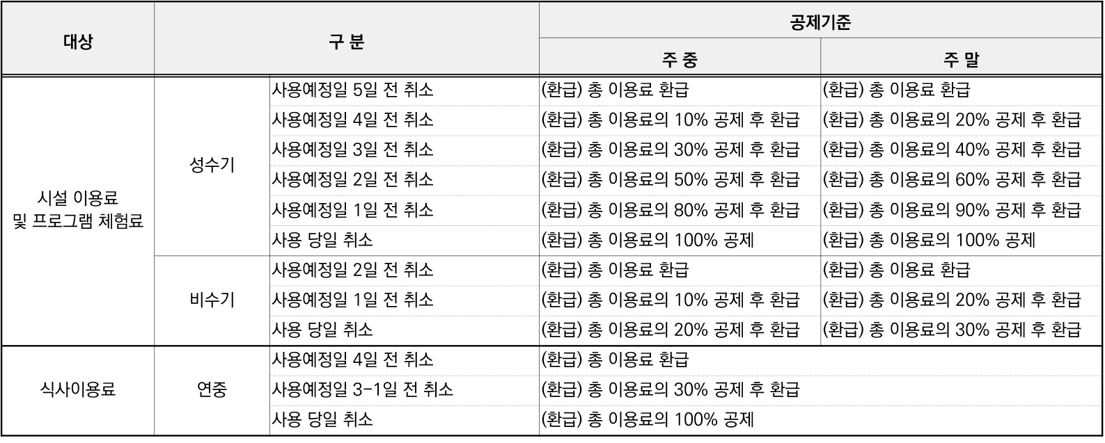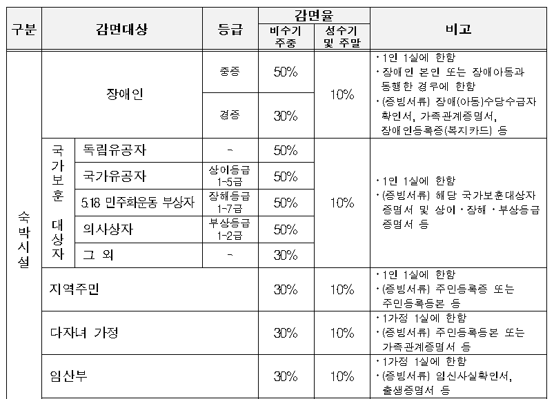 ※ 숙박시설 이용료 감면 기준의 중복적용은 불가하며, 1인이 2개 이상의 기준에 해당할 시 감면율이 높은 것을 적용합니다.