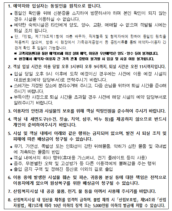 - 산림복지시설 이용 시 아래의 이용자 준수사항을 반드시 지켜주시기 바랍니다.