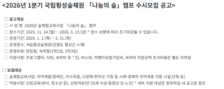 2026년 1/4분기 국립횡성숲체원 나눔의 숲 캠프 수시모집 공고
